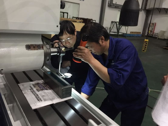 圖為專家在杭機(jī)股份現(xiàn)場抽查M7132H臥軸矩臺平面磨床的幾何精度